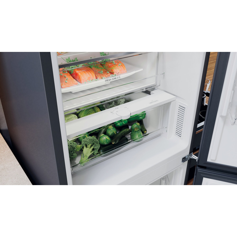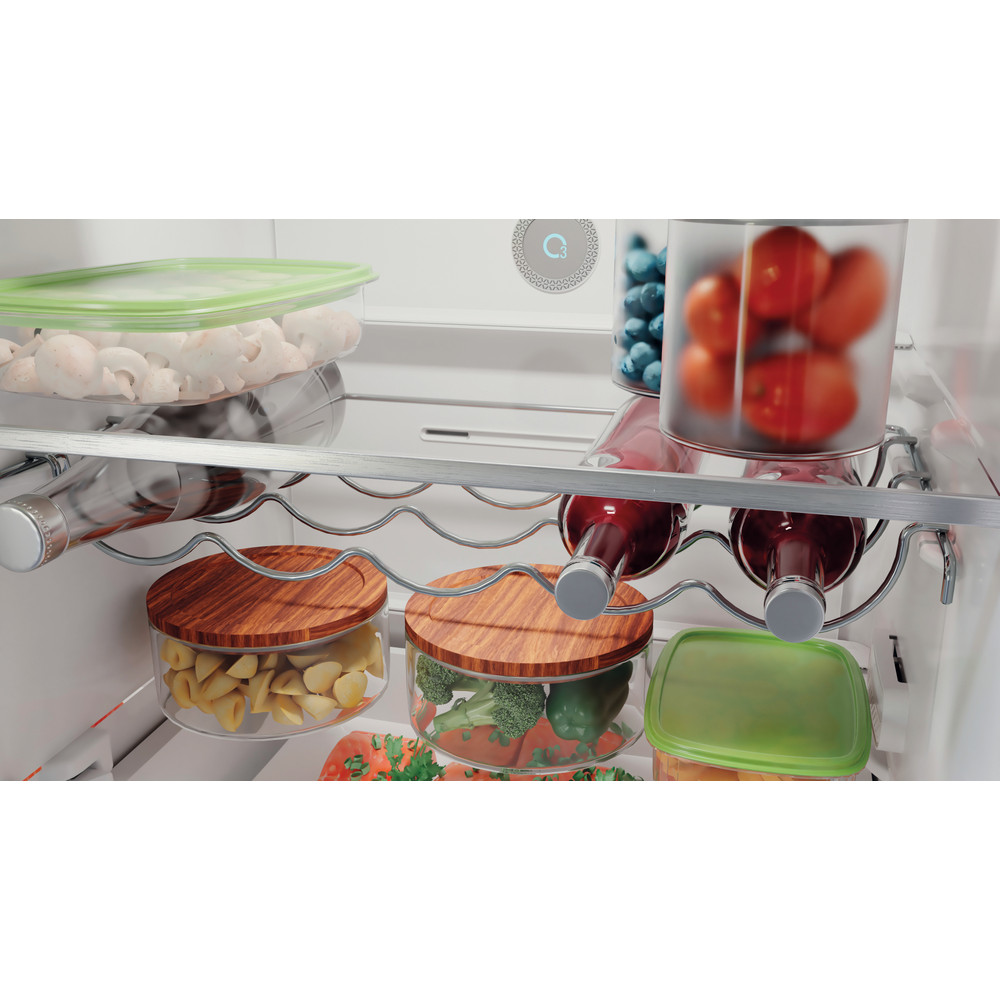 Cechy wolnostojącej lodówko-zamrażarki Hotpoint: wysokie urządzenie spełniające potrzeby całej rodziny. No Frost, technologia bezszronowa skutecznie zapobiega gromadzeniu się lodu w zamrażarce poprzez zmniejszenie ilości wilgoci. Szklane półki zapewniają wytrzymałość i elegancję. Praktyczna półka do bezpiecznego przechowywania butelek.