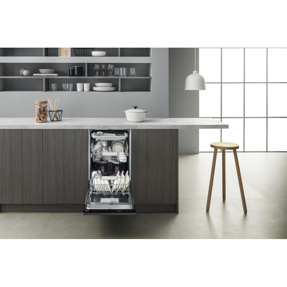 Cechy zmywarki do zabudowy Hotpoint: wąski rozmiar w połączeniu z wyjątkową ilością ustawień pozwalają cieszyć się niezbędną ilością miejsca, zarówno wewnątrz, jak i na zewnątrz zmywarki. Wyjątkowe, zmniejszone zużycie wody w połączeniu z oszczędzającym przestrzeń kompaktowym wzornictwem. Kolor czarny. Innowacyjna technologia gwarantuje bardzo cichą pracę. Wygodny minutnik odmierzający czas do zakończenia cyklu zmywania.